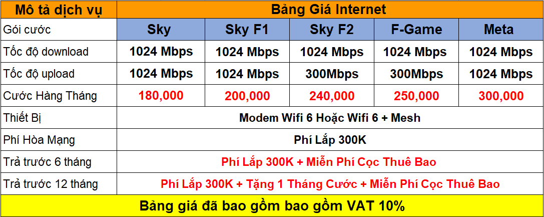 • Internet 300Mbps: từ 185.000đ/tháng